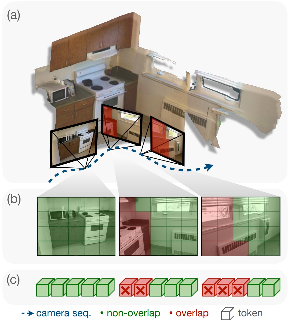 Proposed online Geometry-aware token pruning method leveraging 3D information to identify overlapped redundant visual tokens in 3D scenes, achieving token reduction and +5.1 improvement on OpenEQA gain without fine-tuning.